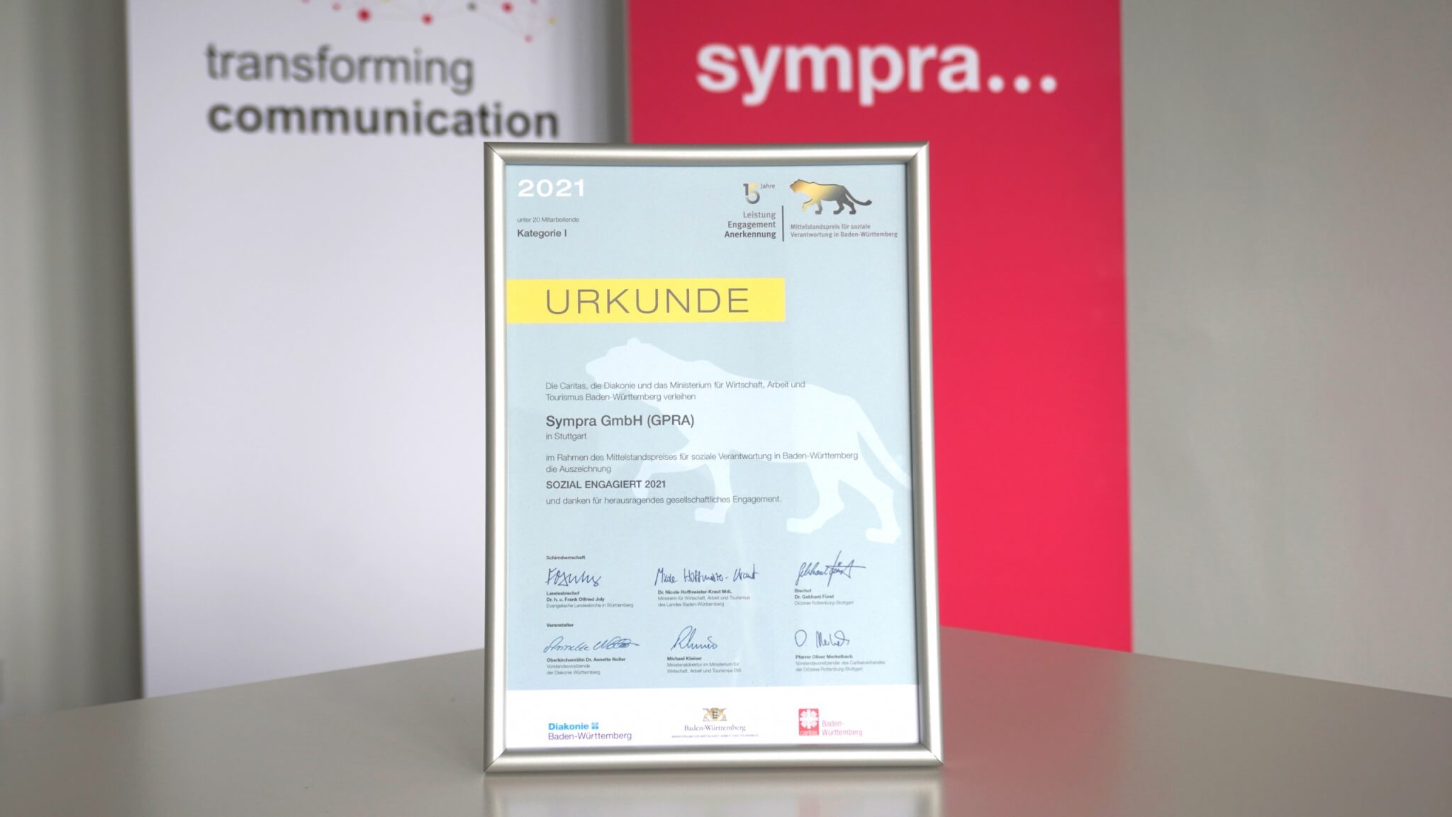 Zum fünften Mal in Folge: Diakonie, Caritas und das Ministerium für Wirtschaft, Arbeit und Tourismus haben Sympra im Rahmen des Mittelstandspreises für soziale Verantwortung in Baden-Württemberg erneut die Auszeichnung „sozial engagiert“ verliehen.