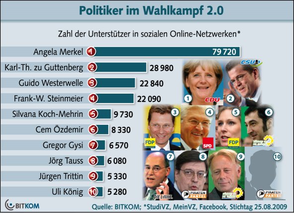 Bundeskanzlerin Angela Merkel hat im Internet die mit Abstand meisten Anhänger aller Politiker in Deutschland. Nach Berechnungen des Hightech-Verbands BITKOM hat die Spitzenkandidatin der CDU für die Bundestagswahl in den sozialen Online-Netzwerken derzeit 79.700 Unterstützer. Die Mitglieder der Online-Communitys können sich bei Parteien und Politikern als „Unterstützer“ eintragen. Sie demonstrieren damit ihre politische Sympathie und werden bevorzugt mit Informationen versorgt. Auf Platz zwei liegt Bundeswirtschaftsminister Karl-Theodor zu Guttenberg (CSU) mit 29.000 Unterstützern, gefolgt vom FDP-Vorsitzenden Guido Westerwelle mit 22.900 Anhängern. SPD-Spitzenkandidat Frank-Walter Steinmeier belegt mit 22.100 Unterstützern Rang vier. Hinter Silvana Koch-Mehrin von der FDP (9.700 Anhänger) ist Cem Özdemir der beste Grünen-Politiker im Web mit 8.300 Unterstützern auf Platz sechs. Der Linke Gregor Gysi folgt mit rund 6.600 Anhängern.