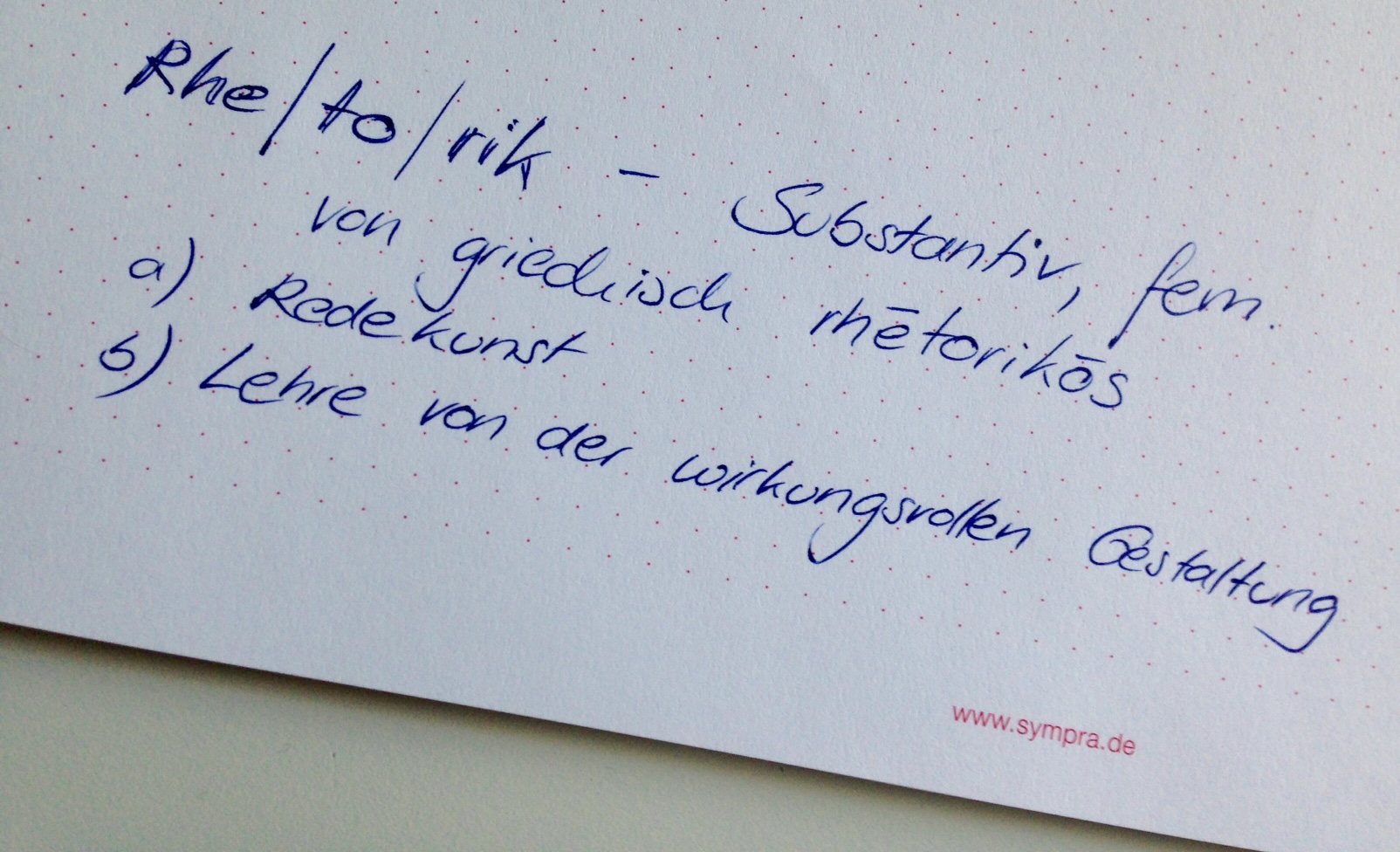 Und was tun, wenn der Diskussionsverlauf einfach nicht funktionieren will? Wenn die Hände nicht wissen wohin mit sich? Wenn die Notizen schon feuchte Abdrücke vom Stressschweiß bekommen? Dann hilft wieder nur noch eins: Innere Haltung einnehmen („Ihr könnt mir mal so gar nix!“) und gegebenenfalls mit wehenden Fahnen untergehen. Klingt dramatisch und das ist es auch, je nach Anlass wohlgemerkt. In der harmlosesten Variante kann man ehrlich eingestehen, dass verschiedene Aspekte im Vorfeld nicht bedacht worden waren. Hauptsache, es ist überzeugend. Und das ist der zentraler Punkt der Rhetorik – zu Zeiten ihrer Entstehung in der griechischen Antike bis heute in die Gegenwart.