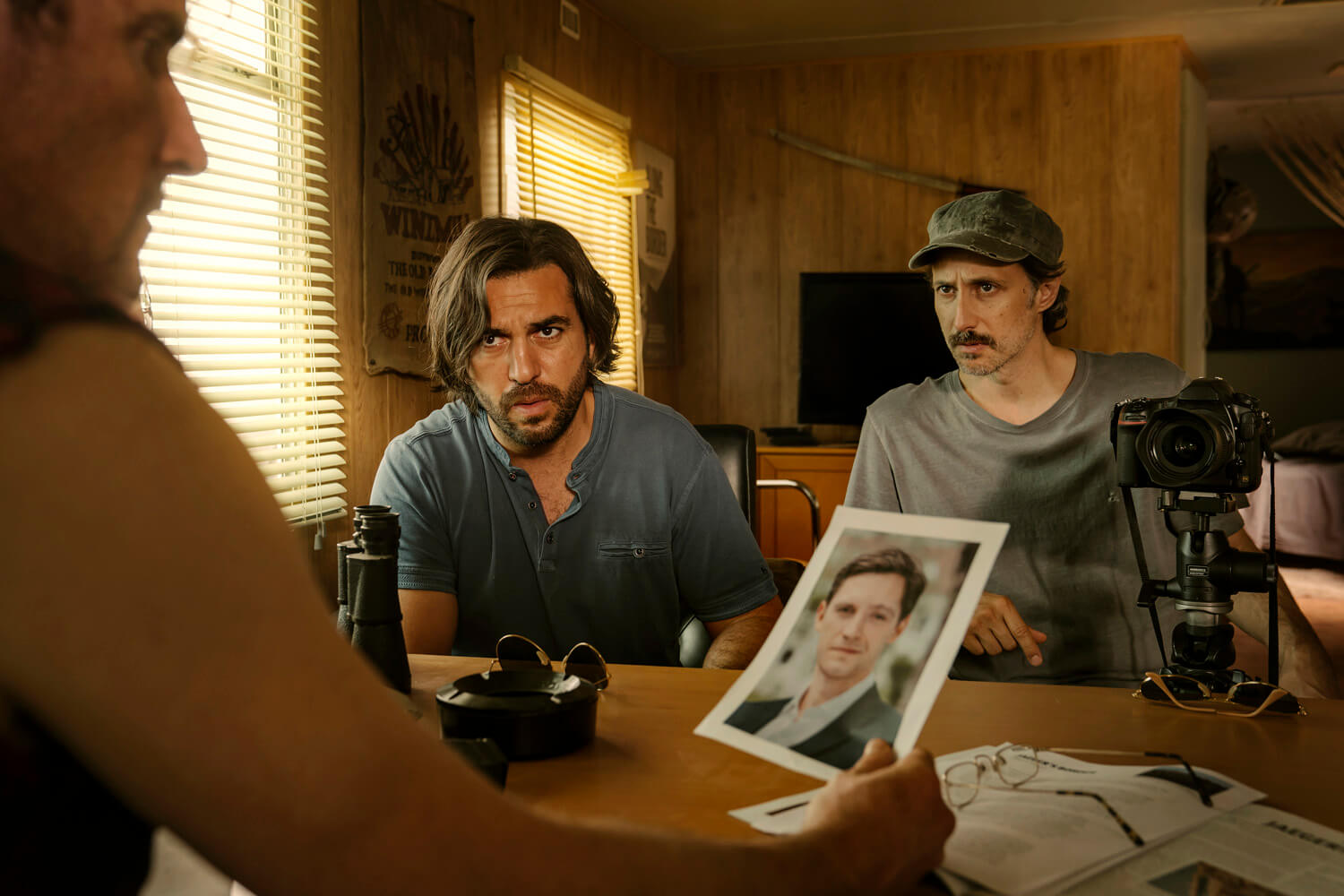 Im Film spielt Schauspieler Elyas M’Barek (links) den Reporter Juan Moreno (im Film Juan Romero). Nach einem Gespräch mit dem Vertreter einer texanischen Bürgerwehr deckt er den Schwindel seines Spiegel-Kollegen Claas Relotius (im Film Lars Bogenius) auf. © UFA Fiction GmbH / Warner Bros. Entertainment GmbH / Marco Nagel
