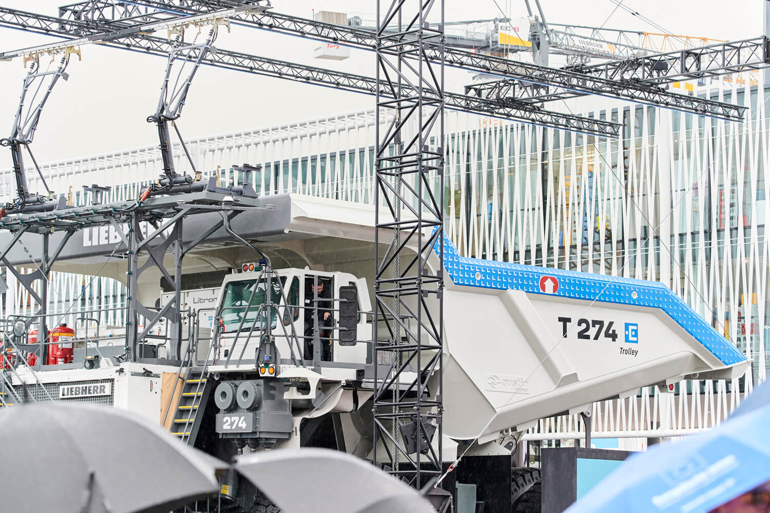 Vor drei Jahren, als die bauma, die größte Messe – manche sagen die größte Show – der Welt zuletzt stattfand, stand der T274 auch schon an gleicher Stelle, damals allerdings noch ohne Trolley-Assistenzsystem. Dieses verbindet das 2700 Kilowatt starke elektrische Antriebssystem des Kipplasters mit dem Stromnetz einer Mine. Ein geschickter Schachzug, denn so steht der T274 quasi nie still, weil ihm nie der Sprit ausgeht. Der Betreiber der Mine kann auf diese Weise nicht nur seine Fahrzeugflotte reduzieren, sondern darüber hinaus auch noch Diesel und damit CO2 Emissionen einsparen.