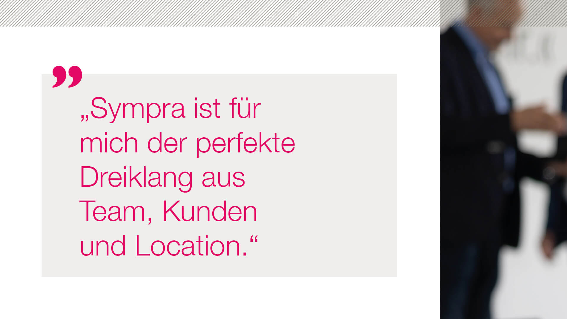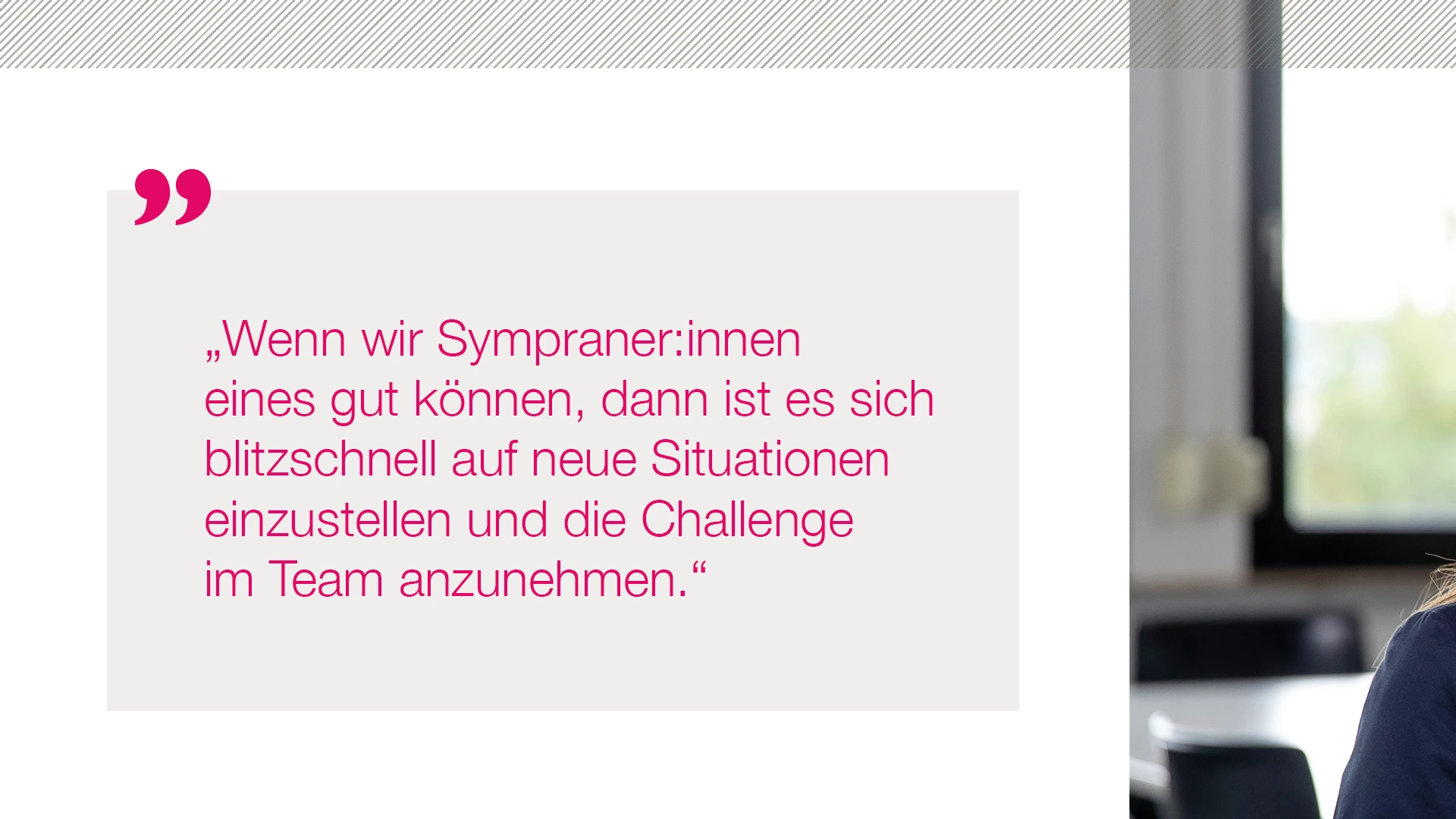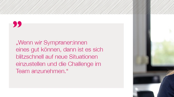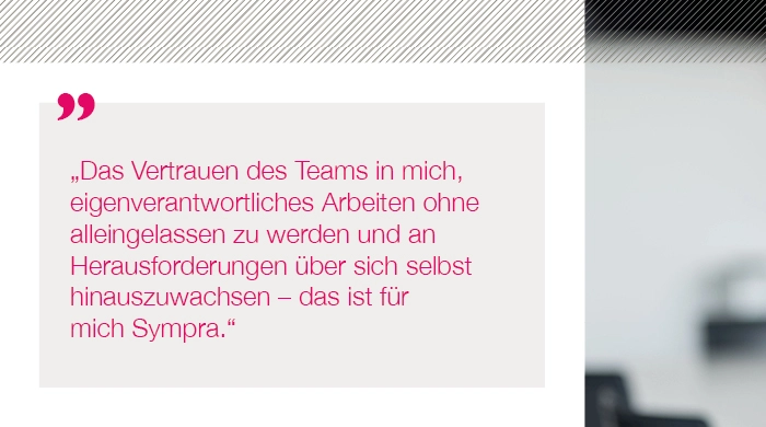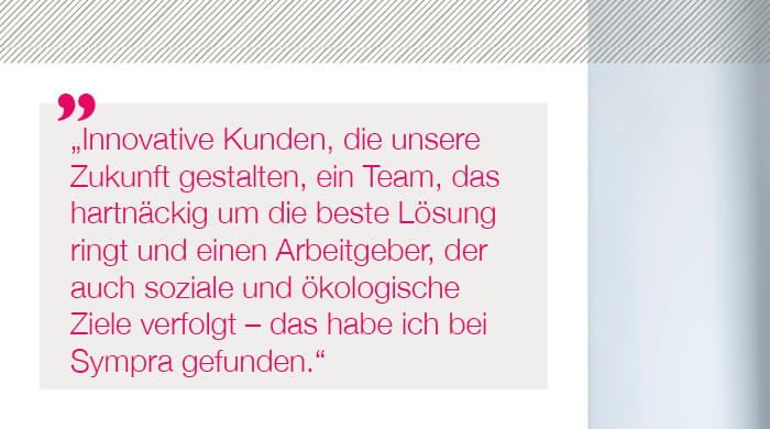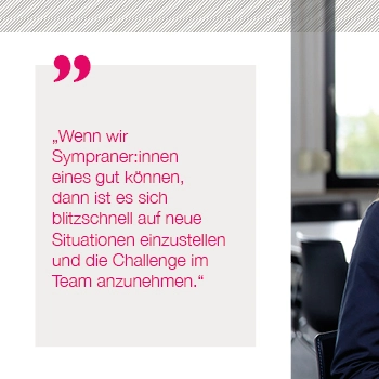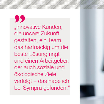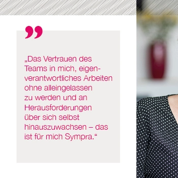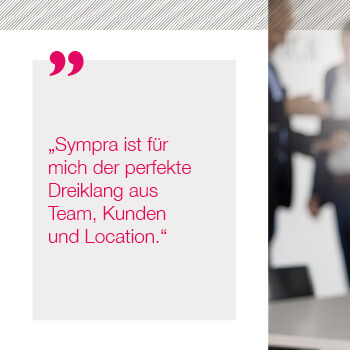 Bei Sympra arbeiten wir auf höchstem Qualitätsniveau – professionell und zuverlässig. Schnelles Agieren und ständiges Neu-Priorisieren liegen uns im Blut. Wir arbeiten am Puls der Zeit und beschäftigen uns mit vielfältigen Zukunftsthemen. Weil wir uns als ein Team verstehen, spielen Arbeitsatmosphäre und Teamgeist für uns eine enorm wichtige Rolle. Unser Umgang miteinander ist respektvoll, wertschätzend und offen, wir unterstützen uns gegenseitig und leben eine „Wir-Kultur“. Nachhaltigkeit prägt unseren Alltag im Denken und Handeln. Arbeiten bei Sympra bedeutet, dass wir uns mit dem, was wir tun und mit der Agentur identifizieren. Wir sind Möglichmacher:innen für unsere Kunden und nehmen hierfür auch gerne mal die Extra-Meile.