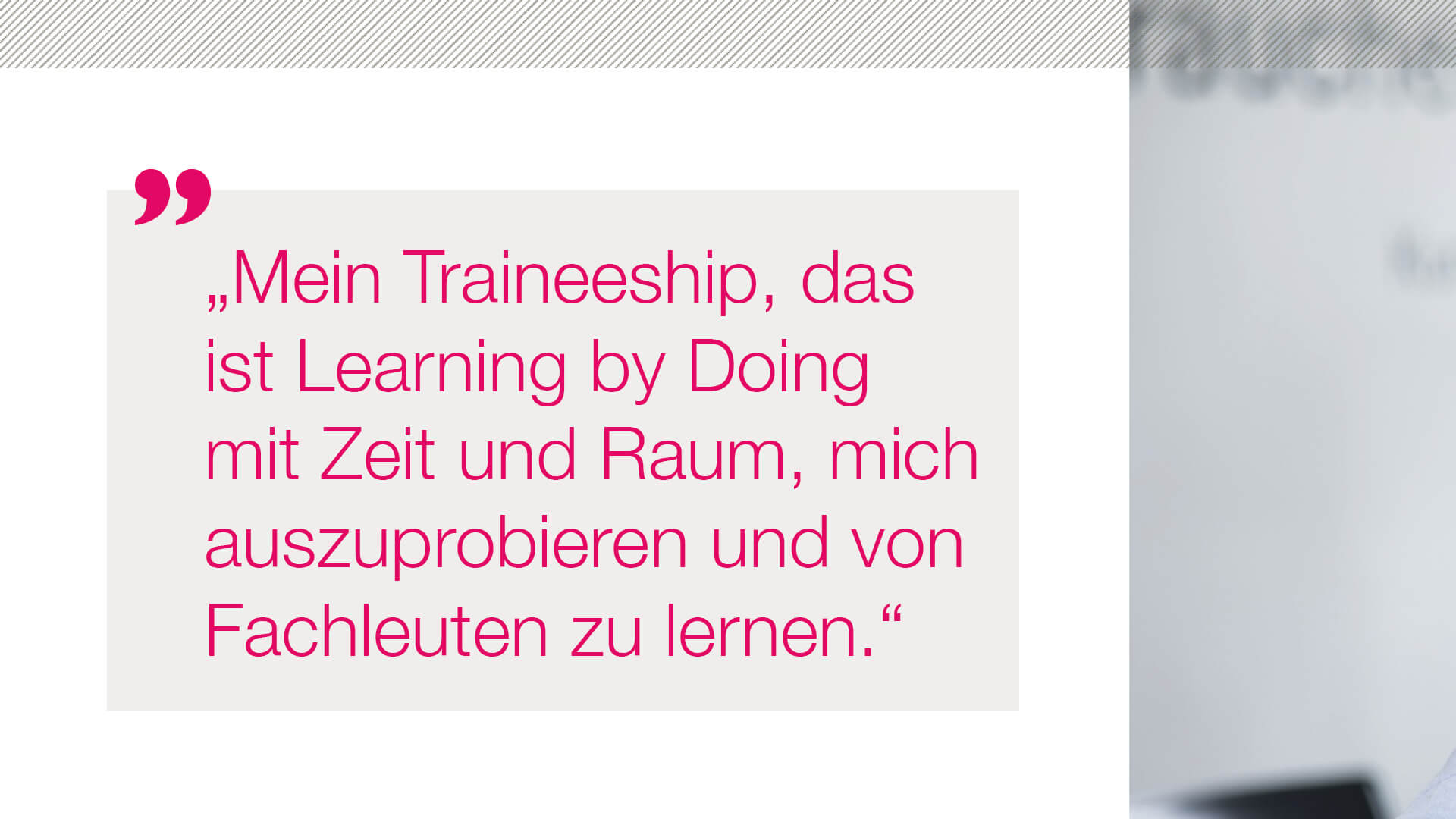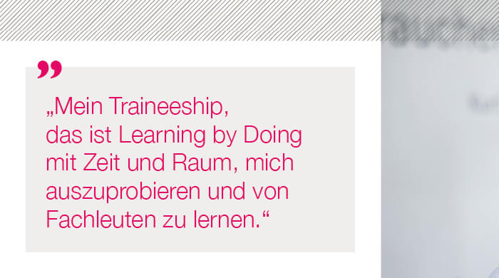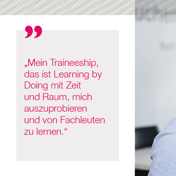 …TRAINEE baust Du auf Deinem Wissen aus dem Bachelor- oder Masterstudium auf und qualifizierst Dich weiter im Training on the Job zum Kommunikations-Profi. Während Deiner 15-monatigen Trainee-Zeit bieten wir Dir ein maßgeschneidertes internes und externes Ausbildungsprogramm, in dem Du Deine Skills und Deine Talente weiter ausbaust. Du übernimmst eigenverantwortlich Aufgaben, bei denen Dich erfahrene Mentoren begleiten, und arbeitest in unterschiedlichen Teams mit. Individuell gewichtete Ausbildungsinhalte und regelmäßiges Feedback garantieren eine steile Lernkurve. Erfolgreiche Trainees übernehmen wir gerne als Junior Consultants. Wie Du das PR-Handwerk bei Sympra von der Pike auf erlernst, erfährst Du im Trainee Talk.
