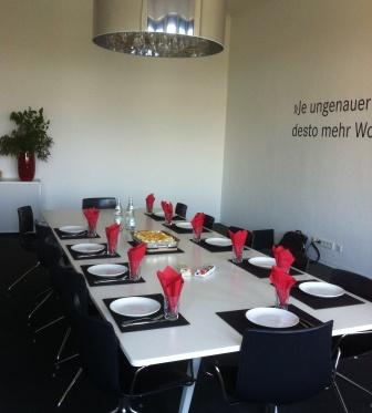 Das Sympra-Mittagessen ist inzwischen längst zum Ritual geworden. Täglich, irgendwann zwischen 12 und 14 Uhr erklingt der Essensruf über die Telefonanlage, und – je nach Projektlage – zwischen 8 und 14 Kollegen stürmen den Besprechungsraum „Carl-Eugen“, der dann vorübergehend zur Kantine mutiert. Speisenauswahl nach Laune des Chefs (= Chefkochs), 1 x vegetarisch, Nachtisch ist Pflicht, Geschäftsführer sind donnerstags dran.