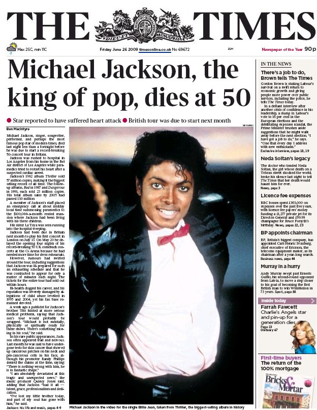 The day I arrived was the day Michael Jackson died. In fact the day began with former American dream girl Farah Fawcett passing away. No, to be honest it started with a live press conference by Governor Mark Sanford who, after going AWOL (absent without leave) for seven days, admitted that he had secretly flown to Argentina to visit a woman with whom he was having an affair. Wiping away the tears, he apologized to his wife and his four sons. CBS, NBC, CNN and all the other stations broadcasted live. Colleagues and experts were in the middle of commentary when suddenly the program was interrupted by the news that Farah Fawcett had passed away after having suffered from cancer. CBS, NBC, CNN and all the other stations broadcasted live. Colleagues and experts were in the middle of commentary when suddenly the program was interrupted by the news that Michael Jackson had been rushed to hospital. CBS, NBC, CNN and all the other stations broadcasted live, at the beginning referring to news brought by the paparazzi news service TMZ.com , showing just a helicopter view of the hospital. Colleagues and experts commented live. What a haunting issue forcing everyone to talk, pray and then mourn – and the media to live-broadcast and to print. Less than 24 hours later at Times Square T-shirts with ”Jacko – R.I.P. 1958-2009“ were sold by the hundreds.
