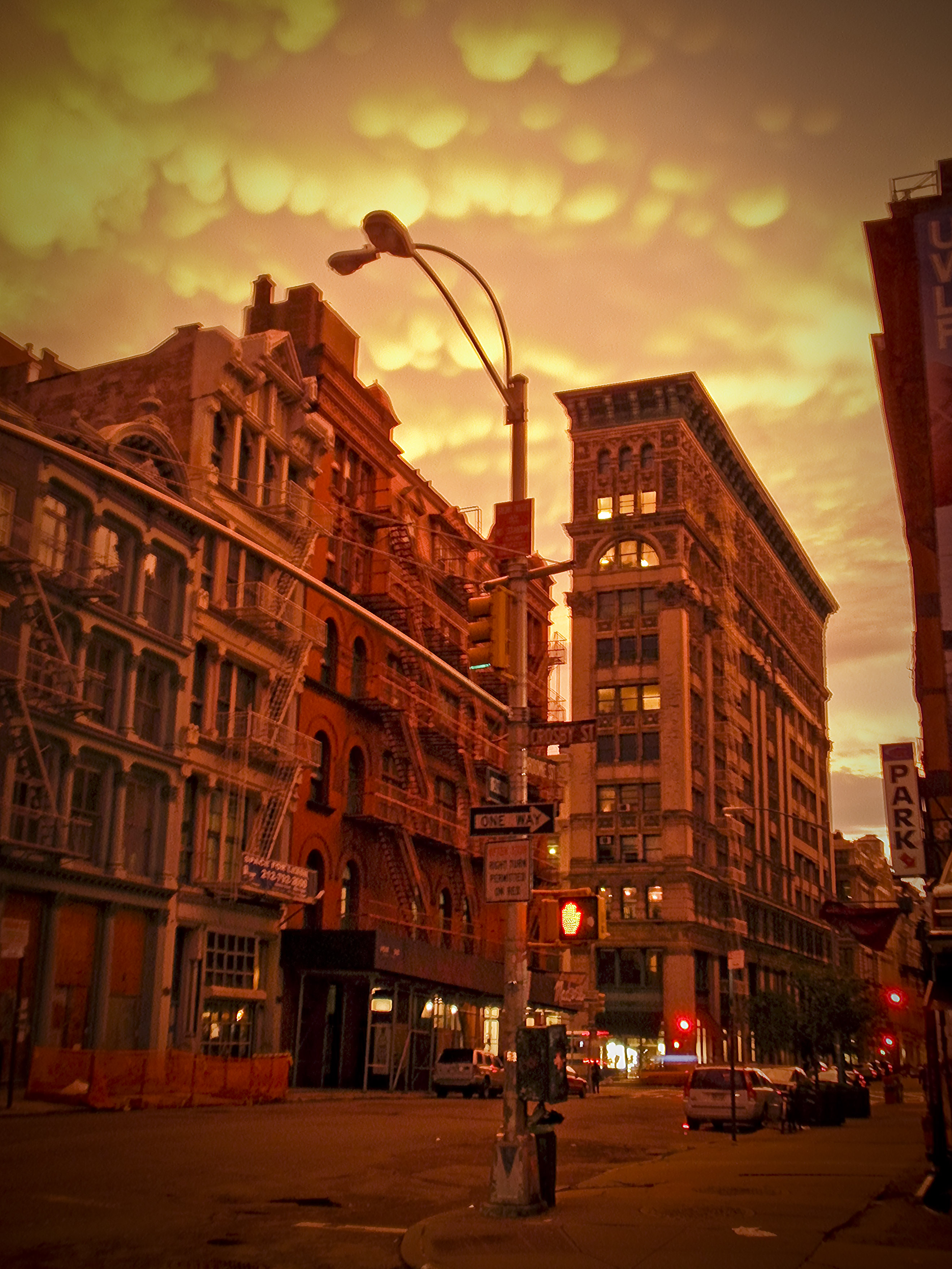 In Chinatown we saw a strange weather phenomena following a heavy thunderstorm: A green-yellow-purple sky with extraordinary clouds shaped like huge balloons. The setting sun dipped the buildings in surreal bright colors. What an experience! And what a flood of tweets and Flicker photos on this meteorological anomaly the next day!
