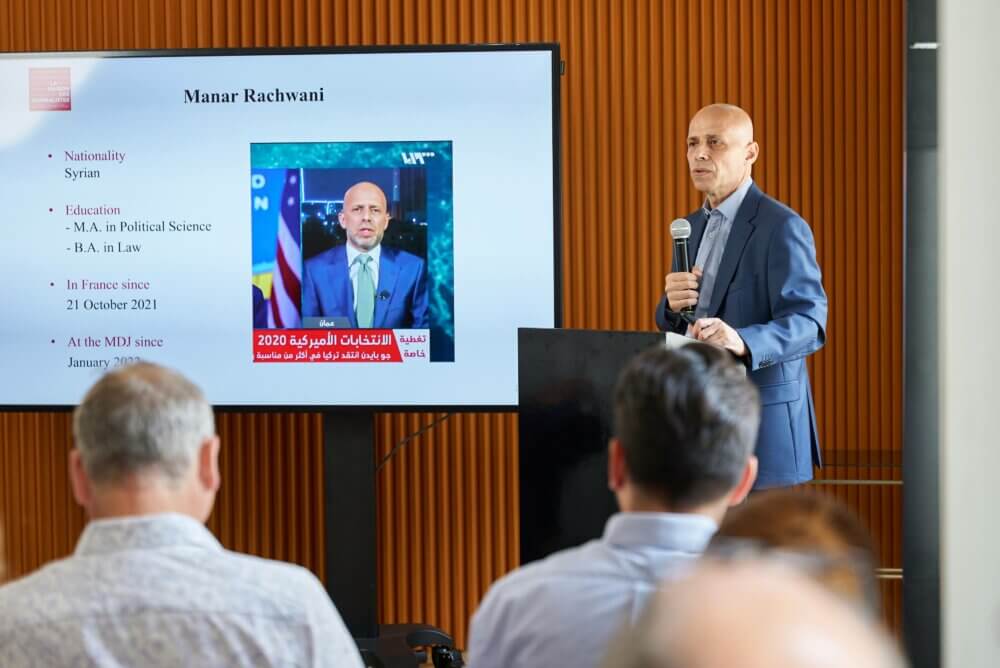 In einer sehr persönlichen Keynote berichtete der syrische Journalist Manar Rachwani aus eigener Erfahrung, wie eine freie Berichterstattung in der arabischen Welt vereitelt und Medienschaffende an ihrer Arbeit gehindert werden. Aus Syrien nach Jordanien geflohen, war Manar Rachwani nach verschiedenen Stationen als Chefredakteur von „Syria direkt“ tätig, einem Medium, dass sich mit den Handlungen des syrischen Regimes objektiv auseinanderzusetzen versuchte. 2021 beschuldigte ihn der jordanische Geheimdienst der Spionage, insbesondere für Frankreich. Vor die zweifelhafte Wahl gestellt, sich und sein Team ins Gefängnis und damit in Lebensgefahr zu bringen oder das Medium zu schließen, zog es Manar Rachwani vor zurückzutreten. Die französische Botschaft gewährte den syrischen Journalisten Asyl; aktuell lebt Manar im „Maison des Journalistes“ in Paris. Sein Ziel trotz allem: Die in Europa von uns als so selbstverständlich empfundene Pressefreiheit zu nutzen, um ein auf die arabische Welt spezialisiertes, investigatives Online-Medium zu gründen. Allergrößter Respekt war das Mindeste, was wir ihm zollen konnten.