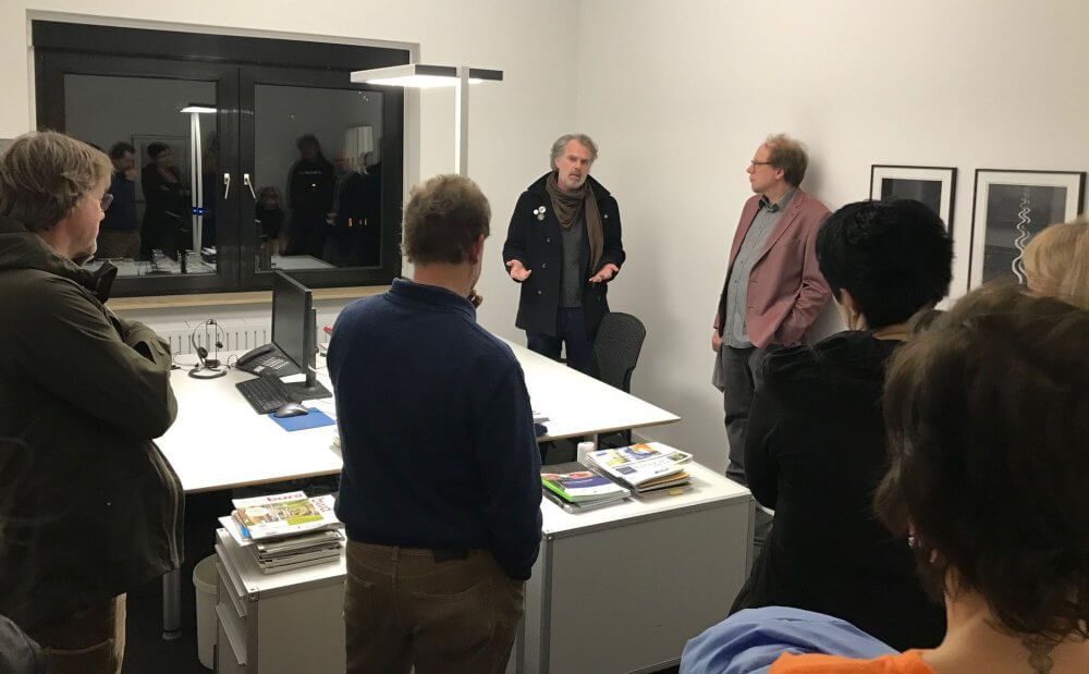 Der Kurator und die Künstler gaben persönliche Einblicke in ihre Arbeit und erzählten von ihrer Inspiration und Motivation. Warum er dieses Mal, und ausgerechnet zur Winterzeit, zahlreiche dunkle Bilder mitbrachte, erklärt Schacher so: „Wir werden in den Medien täglich mit vielen schlimmen Bildern konfrontiert, die Straßen sind laut, es ist oft hektisch. Passend zur Vorweihnachtszeit, die der Startpunkt für diese Ausstellung war, wollte ich ganz bewusst eine ruhige und nachdenkliche Atmosphäre erzeugen. Selbst die farbigen Bilder zeigen einen bestimmten festgehaltenen Moment, den man auf sich wirken lassen muss.“