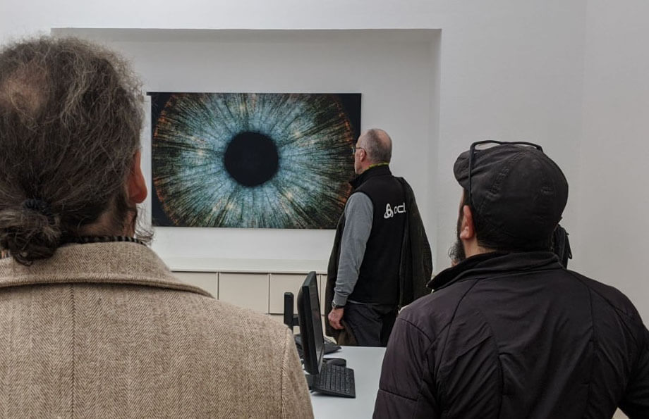 So geht es z. B. unseren Kollegen Julia Wolf und Christoph Miller, in deren Büro das Kunstwerk „Im Süden der Vollmond“ von Josh von Staudach hängt (siehe Bild). Auf den ersten Blick sieht es aus wie ein riesiges Auge. Ob die beiden sich beim Arbeiten nicht permanent beobachtet fühlen? „Vermutlich nicht, wenn man weiß, dass das gesamte Bild eigentlich aus fünf Panoramaaufnahmen vom Stuttgarter Fernsehturm mit umliegendem Wald besteht“, wirft der Künstler ein. Alle schmunzeln, denn er hat recht. Auch Schacher unterstreicht, dass die Langzeitwirkung dieser Kunstwerke eine ganz andere sein kann, als die des ersten Eindrucks. „Es war sehr spannend, mit den Exponaten herein zu kommen. Es macht mir Spaß, die Bilder in diesem verwinkelten Haus auch mal unkonventionell zu platzieren und die Reaktionen abzuwarten. Schließlich hängen die Werke dann auch über Monate in den Büros, in denen die Mitarbeiter wiederum einen Großteil ihres Alltags verbringen.“
