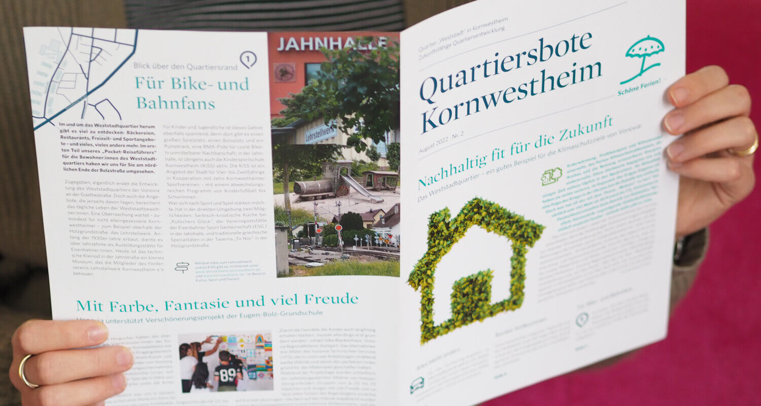 Passgenaue Kommunikation gelingt mit dem Quartiersboten, einem Newsletter der besonderen Art, der dreimal im Jahr erscheint. Neben den Updates zum Stand der Sanierungsarbeiten erfahren die Mieter:innen beispielsweise Wissenswertes zum Carsharing-Angebot, erhalten Infos zum Müllsystem oder bekommen einen Einblick, welche politischen Stakeholder im letzten Quartal zu Besuch im Quartier unterwegs waren. Fester Bestandteil ist dabei auch die Rubrik „Blick über den Tellerrand“, in der den Quartiersbewohner:innen die Umgebung rund um ihr Wohnviertel vorgestellt wird.