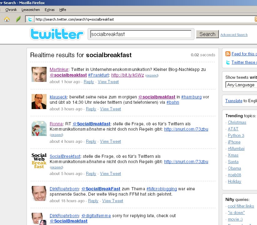 Wohl kaum ein anderer Dienst beschäftigt die PR-Welt im Moment derart wie das Micro-Blogging-Tool Twitter. Zumindest konnte man an diesem Dezember-Morgen in Frankfurt diesen Eindruck gewinnen: Die Initiative Social Web World hatte zu einem Social Web Breakfast eingeladen. Und über 30 Interessierte sind gekommen. Die meisten davon PR-Leute, darunter viele passionierte Twitterer, passive (?!) Twitterer und ganz Mutige, die in der Runde erzählen, sie hätten noch nie getwittert.