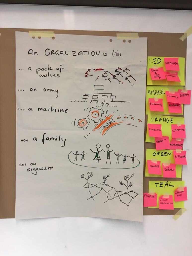 Die Workshop-Sessions gestalteten sich sehr interaktiv. Anstatt mit PowerPoint-Folien und weißen Worksheets wurde mit Plakaten und Post-its jeder Größe und Farbe gearbeitet, was dem Ganzen eine schöpferische und kreative Note verlieh. Aber nicht nur auf den Plakaten, sondern auch in den Köpfen der Teilnehmer wurde es bunt. Gleich zu Beginn setzten sie sich mit der Farbtypologie von Frederic Laloux auseinander und stuften so die Entwicklungsstufen ihrer Organisationen ein. Von Grün zu Orange, von Orange zu Türkis – so plastisch die Farben auch waren, sie halfen sehr, sich auf das Wesentliche zu konzentrieren und brachten frischen Wind in die ernsten Themen.