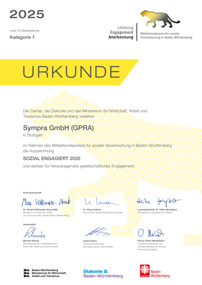 Sympra wurde in diesem Jahr bereits zum neunten Mal in Folge als „sozial engagiert“ ausgezeichnet, war 2024 sogar für den Lea Award nominiert. Beworben haben wir uns mit unseren Aktivitäten rund um unsere Streuobstwiese, der PR-Aktivitäten für diese bedrohte Kulturlandschaft, unseren Einsatz für soziale Einrichtungen und unseren Wissenstransfer für mehr ökologische Projekte in der Kreativwirtschaft.