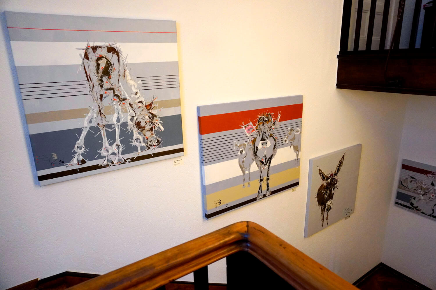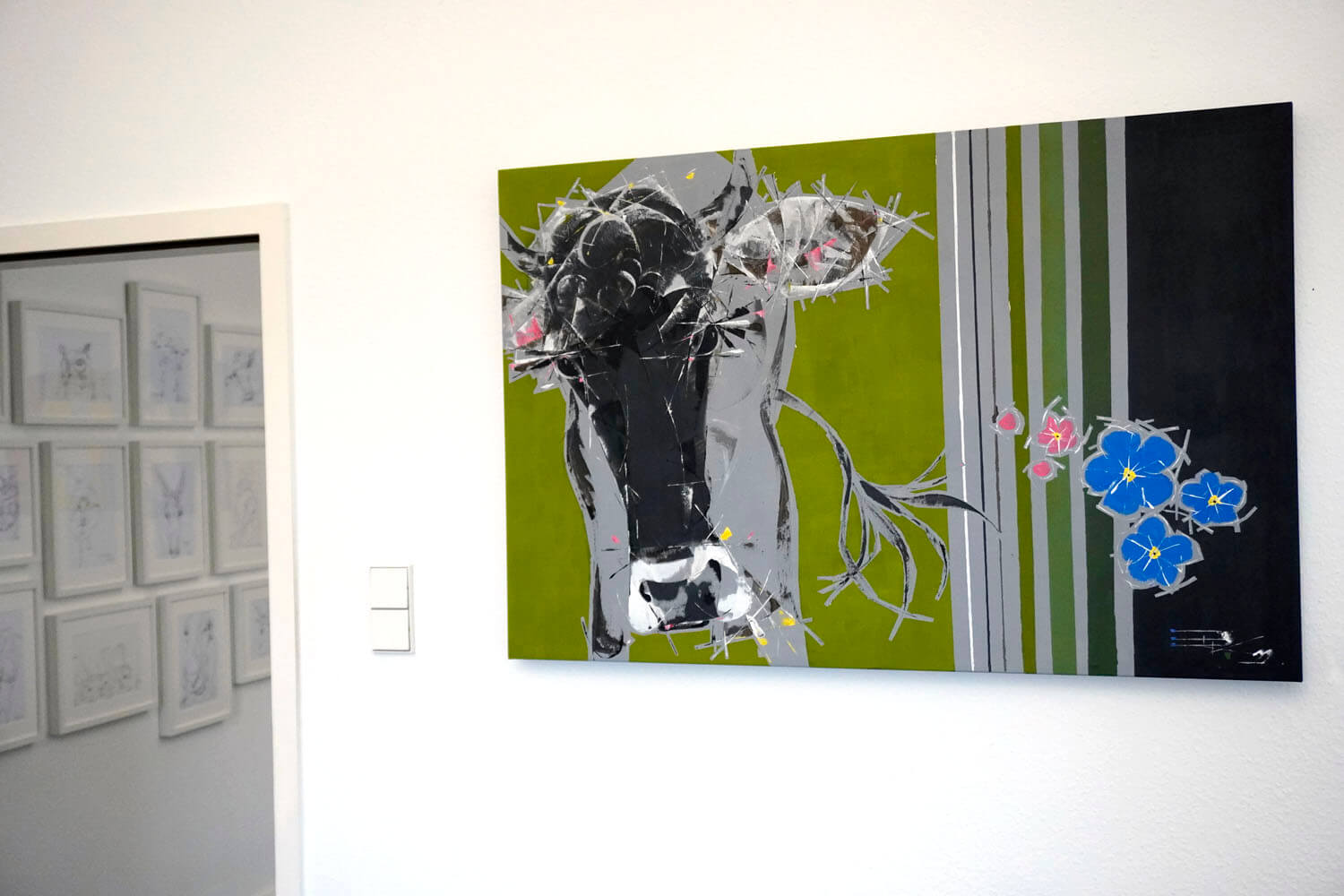 Die Tiroler Künstlerin Patricia Batkowski-Kuderer bespielt ab dem 20. Oktober das Büro von Sympra mit ihren fröhlichen Bildern, meist vergnügliche tierische Begegnungen in den Bergen: mit Steinböcken, Kühen, Schafen und anderem alpinem Getier. Reduziert auf ihre charakteristischen Merkmale, herausgefiltert in vielen Skizzen, auf Leinwand gebannt mit Acryl, gedruckt, gespachtelt oder beides. Oder auf Kleidung gedruckt, jeweils als Einzelanfertigung. Man glaubt, im Sympra-Büro Bergluft zu atmen und in der Ferne Kuhglocken zu hören; blökt da nicht irgendwo ein Schaf …?