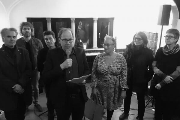 Still war die Eröffnung der aktuellen Kunstausstellung hier bei Sympra so gar nicht. Wir begrüßten zahlreiche fröhliche Gäste, den stolzen Kurator Marko Schacher und die ausstellenden Künstler (s. Bild) sowie das Musiker-Paar Zweisamt, das zusätzlich für gute Stimmung sorgte. In gemütlicher Atmosphäre bei Currywurst und Wein diskutierten die Gäste angeregt über die unterschiedlichen Stile der Künstler und die besondere Installation der Fotografien durch den Kurator.