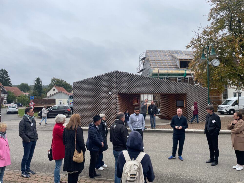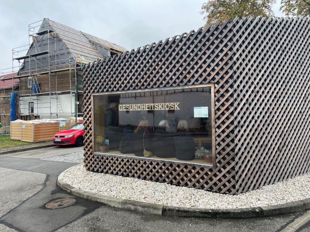Wir kommen in Blankenburg an und werden vom Bürgermeister Christopher Kaufmann vor dem Backhaus des Dorfes bereits erwartet. Er wird uns berichten, wie er hier gegensteuert, um das Leben auf dem Land wieder attraktiver zu machen. Das erste Beispiel hierfür steht gleich gegenüber des Backhauses: der Gesundheitskiosk von Blankenburg – einer von fünfen in der Region. Entwickelt und gebaut in experimenteller Holzbauweise von PASEL-K Architects. In den Gesundheitskiosken erhalten die Dorfbewohner zu festgelegten Zeiten Gesundheitsberatung, Unterstützung beim Ausfüllen von Formularen und andere Services. Über frei zugängliches WLAN und große Fachbildschirme können sie mit Ärztinnen und Ärzten im nächstgelegenen Gesundheitskiosk oder in der Klinik sprechen. Ganz nebenbei ist der Kiosk auch Treffpunkt für Jung und Alt.
