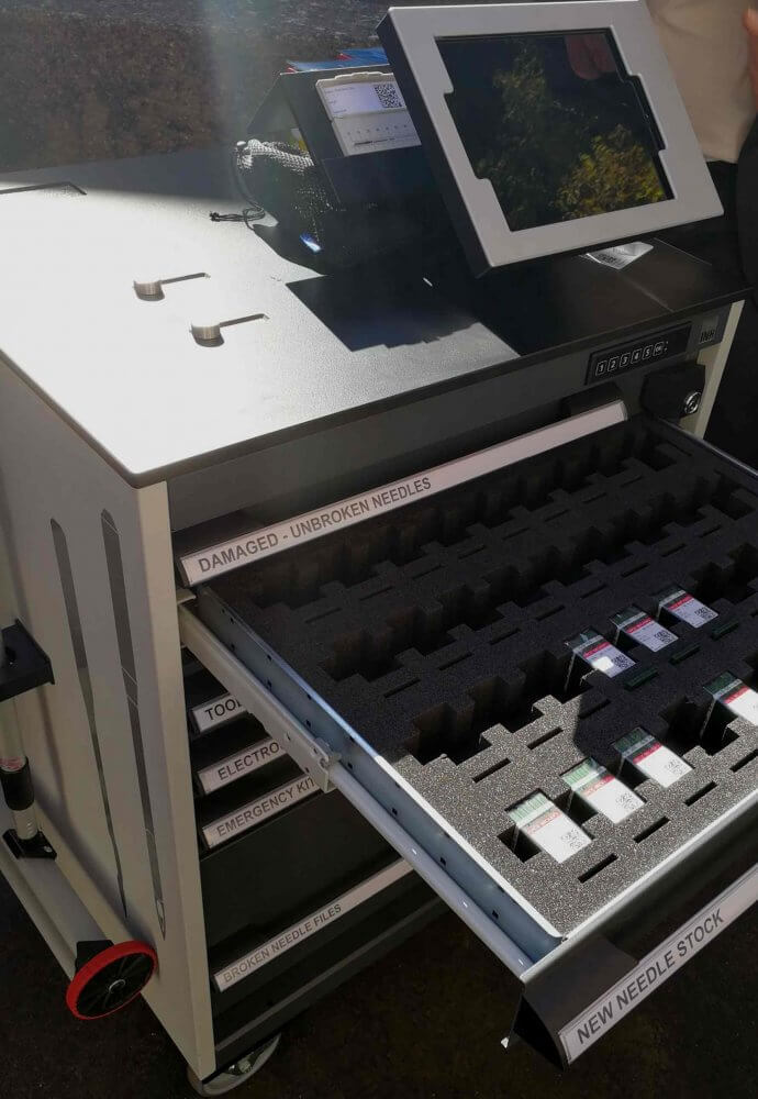 Beim Zusammennähen von Hosen, Blusen & Co brechen jedes Jahr rund 5 Milliarden industrieller Nadeln. Für die Bekleidungsindustrie ein echtes Problem, denn bereits kleinste Splitter können Verbraucher verletzen. In den USA hat das schon zu Schadensersatz in Millionenhöhe geführt. Einen internationalen Standard, wie Nähereien mit Nadelbruch umzugehen haben, gibt es nicht. Wie auch immer das Ganze abläuft, das Verfahren ist mühselig. Nähmaschinen werden gestoppt, die winzigen Teile mit Fingerspitzengefühl und Metalldetektor gesucht, die Fundstücke als Beweis auf Papier geklebt, über Jahre aufbewahrt. Das muss doch für unsere Kunden einfacher gehen, dachte man sich bei Grotz-Becker – einem der weltweit führenden Hersteller von maschinellen Industrienadeln. Die pfiffigen Köpfe in Albstadt tüftelten ein spezielles Qualitätsmanagement aus und ließen es unter dem Namen INH (Ideal Needle Handling) patentieren. Das Herzstück ist ein Nadelausgabewagen, zugleich Sammelstelle für beschädigte und gebrochene Nadeln. Der Prozess machte das Handling beim Nadelbruch deutlich effektiver. Allerdings: die Nadelbruchstücke mussten weiterhin manuell auf Papier geklebt und physisch aufbewahrt werden.