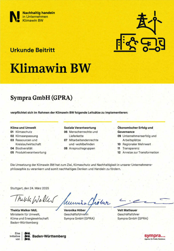 Neben den Maßnahmen, die wir realisiert haben, um unsere Emissionen weiter zu senken – unter anderem konnten wir unsere Firmenflotte weiter elektrifizieren – haben wir auch Einblicke in die Themen gegeben, die uns im letzten Berichtsjahr beschäftigt haben. Denn wir sind auch in anderen Bereichen aktiv: Regionales Engagement und Nachwuchsförderung gehören bei Sympra genauso zu einem nachhaltigen Wirtschaften dazu wie Anreize für Transformationen zu schaffen, egal ob gemeinsam mit unseren internationalen Partneragenturen oder etwa bei künstlicher Intelligenz.